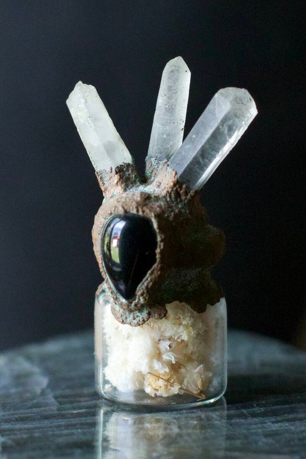 This tiny glass bottle (pendant) is filled with lovely white flowers, decorated with lemurian crystals and a onyx cabochon.